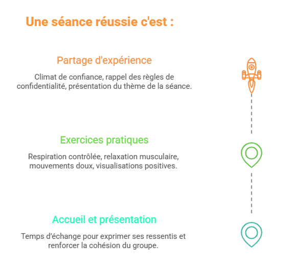 Chaque séance débute par un temps d’accueil, où chacun pose ses mots, son humeur du jour. Vient ensuite la phase de relaxation, où la respiration s’associe à de petits mouvements doux et symboliques : ouvrir les bras, relâcher les épaules, s’enraciner.