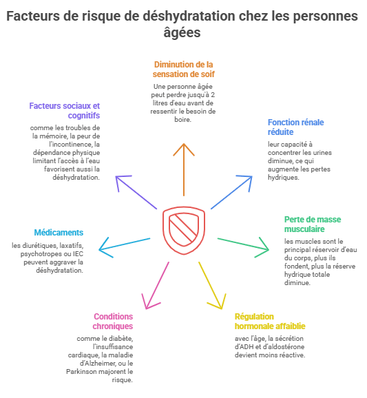 Avec l’âge, la régulation de l’eau corporelle devient moins efficace. Plusieurs mécanismes physiologiques expliquent cette fragilité :